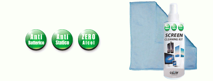 L’accoppiata vincente per una pulizia estrema e senza alcol. Il prodotto protegge qualsiasi tipo di schermo da polvere ed impronte senza danneggiarlo in alcun modo. SCREEN CLEANING KIT può essere usato su qualsiasi tipo di schermo LCD, plasma e touchscreen ed è la migliore formula per la pulizia. Garantisce un effetto anti-batterico per almeno 24 ore.